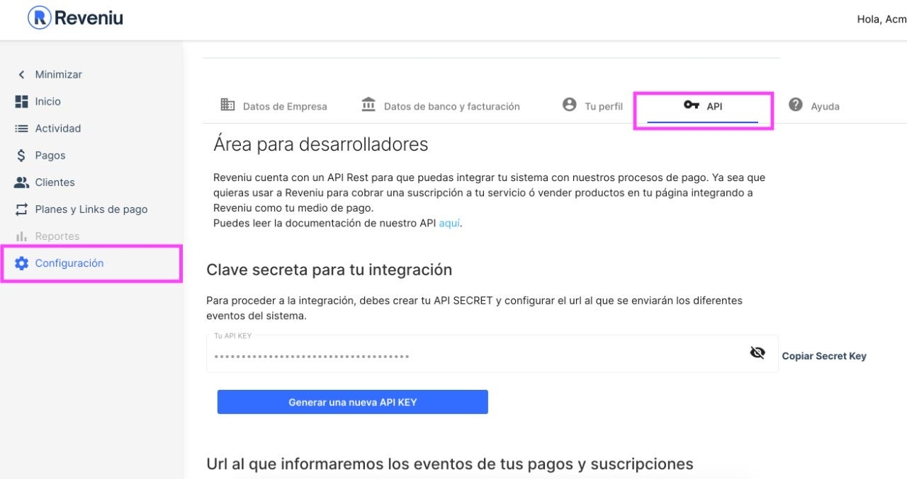 Una vez que esté lista tu integración, debes generar una nueva clave desde la cuenta de producción en tu negocio y apuntar los servicios a los correctos.